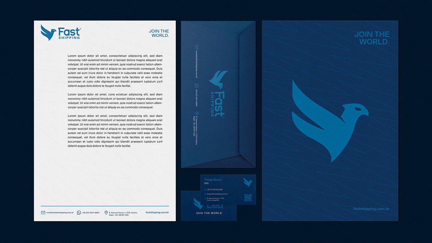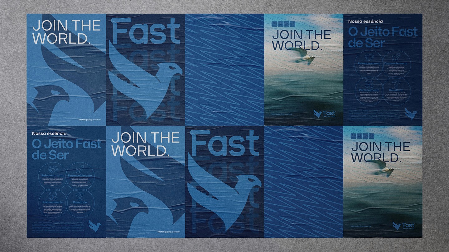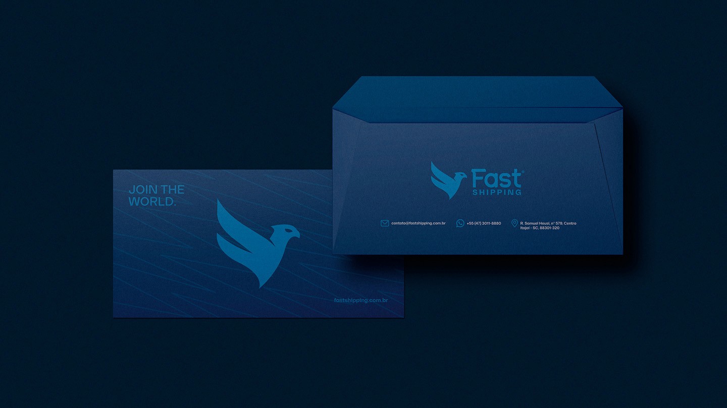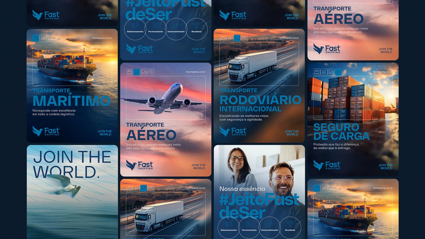 Na identidade visual, o símbolo do falcão-peregrino foi reinterpretado para refletir atributos como velocidade, precisão e foco em resultados, com um redesenho que trouxe mais contemporaneidade, consistência e versatilidade às aplicações. O projeto se desdobrou na criação de um sistema de identidade aplicado aos diversos pontos de contato da marca, incluindo comunicação e ambiente, além do desenvolvimento de um novo site institucional, alinhado à estratégia e à experiência da marca. Como resultado, a Fast Shipping passa a se posicionar de forma mais clara, consistente e fiel à sua essência, fortalecendo sua presença e percepção no mercado.